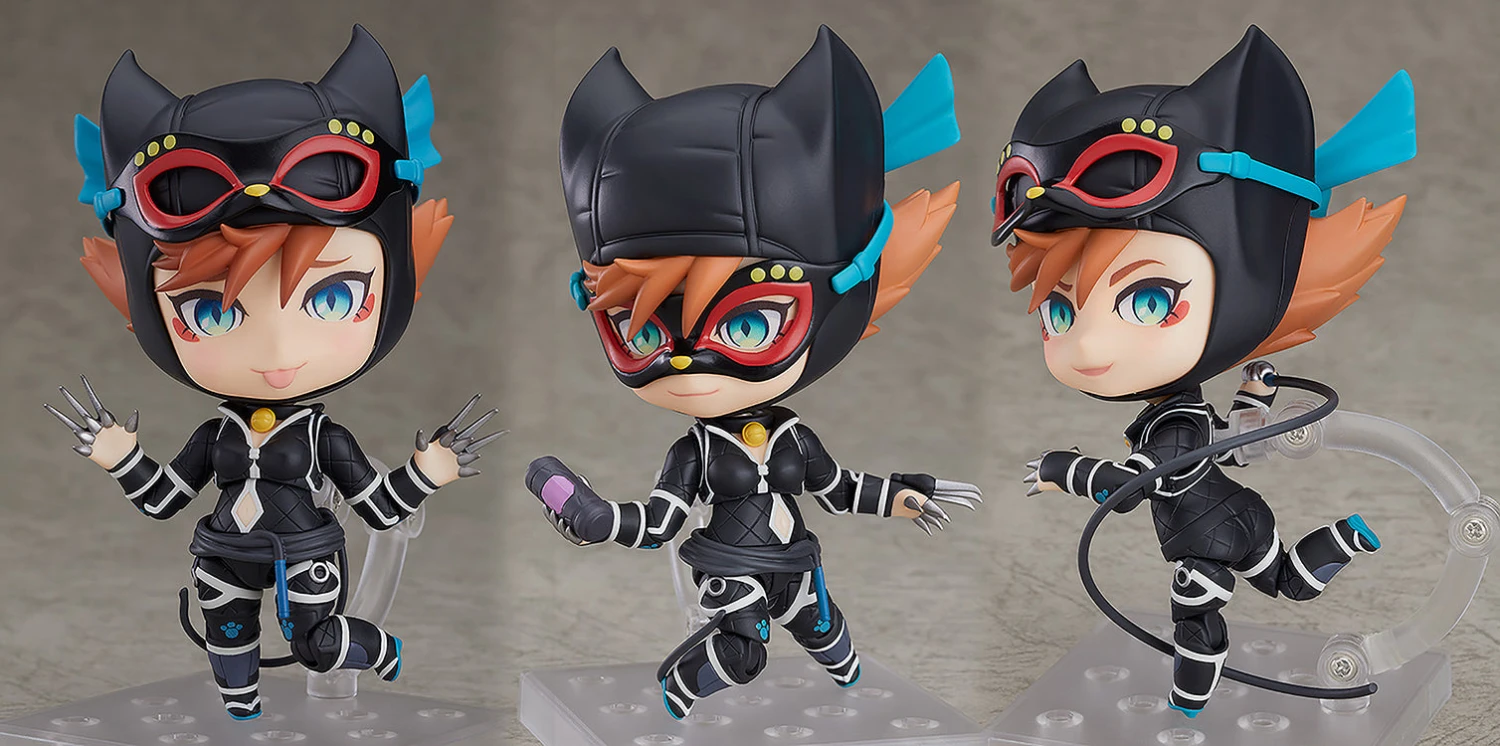 Description: From Good Smile Company. From the animated action film that features Batman travelling to the Sengoku period of Japan, Batman Ninja, comes a Nendoroid of Catwoman! She is wearing her ninja outfit and is fully articulated allowing for all sorts of posing options. The careful paintwork and use of glossy and matte paints to capture different textures allow for beautiful details, and her mask can be attached and removed with ease. She comes with three face plates including a standard expression, a provoking expression as well as a cat-like expression with her tongue out! The whip she has tied around her waist like a cat’s tail can also be removed, and she comes with a separate whip which can be held to display her in battle scenes! Hand parts that include her extended claws are also included to place her in a different combat style!
