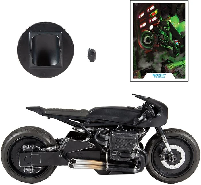 Description: The Batcycle is The Batman’s sleekest mode of transport, and perfect for allowing the hero to race through Gotham’s streets at breakneck speeds. This Incredibly detailed vehicle based on the Batcycle from the upcoming DC movie The Batman is designed with rotating wheels, and turning handlebars. The vehicle comes with a base along with a collectible art card with vehicle photography on the front, and vehicle biography on the back. .