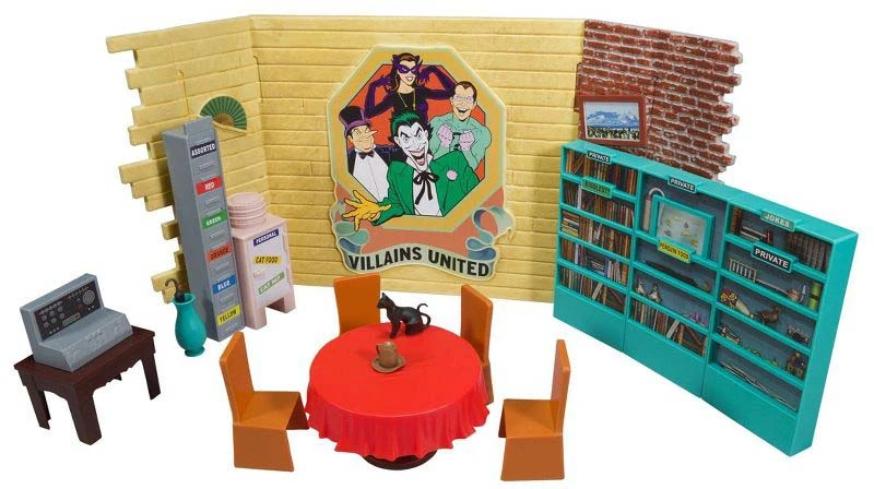 Description: Villain’s Lair includes lair walls, bookshelf, file cabinet, umbrella vase holder, umbrella, table with four chairs, table with radar, milk with saucer, and Hecate the cat.