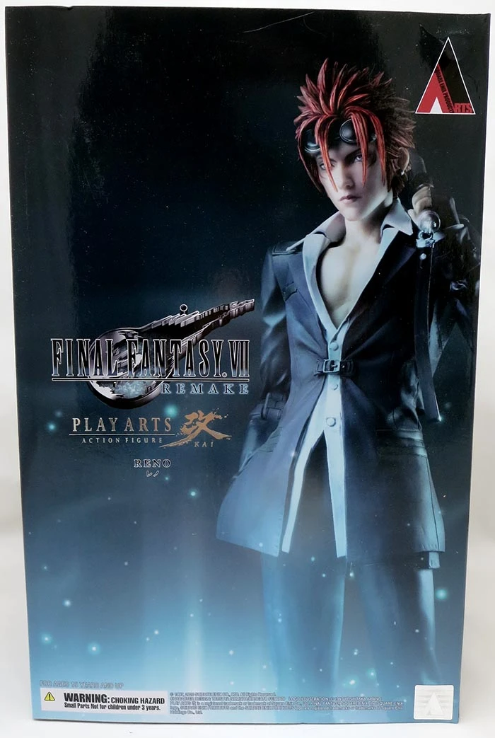 Description: From Square Enix. From Final Fantasy VII Remake, Reno, a member of the elite Shinra squad called the Turks, makes an appearance as a Play Arts Kai figure! His slim silhouette, the suit he casually wears, and his eye-catching red hair are some of the delicate details that were faithfully recreated in this figure. Reno comes with his weapon of choice, a baton, various interchangeable hand pieces, and two additional head pieces that feature different facial expressions. This 10 7/8″ tall figure encapsulates Reno’s capricious and elusive presence, just like in the game. Figure includes display stand.