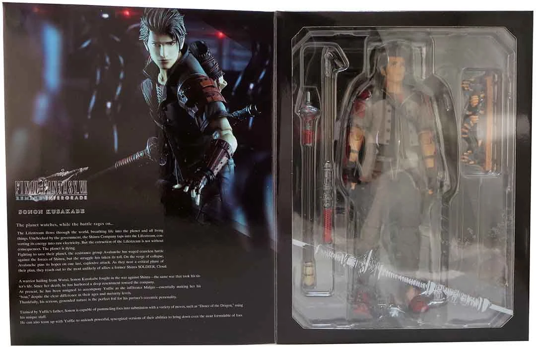 Description: From Square Enix. From Final Fantasy VII Remake Intergrade, Wutaian warrior Sonon Kusakabe and Wutaian ninja Yuffie Kisaragi join the fray as a PLAY ARTS KAI action figure! From his strong but gentle facial expressions to his brawny physique, Sonon’s contrasting look from his partner is nicely recreated in this figure. From her jovial facial expressions to her nimble limbs and her iconic moogle cape, we spared no effort to recreate Yuffie’s updated look from the remake. Figures include display stand..