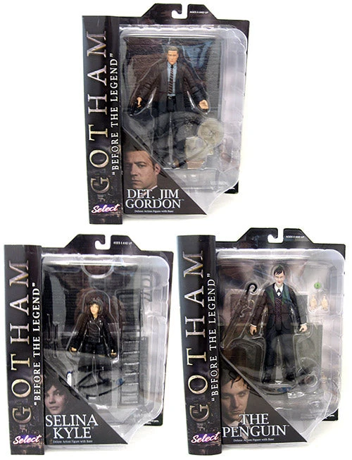 Description: A Diamond Select Toys release! One of the hottest shows on TV is Gotham, a look at the crime-ridden streets of Batman’s hometown. Now, the hit show is an all-new line of Select action figures! Each 7-inch scale figure comes with character-specific accessories, as well as a deluxe diorama base representing a location in Gotham City: The Penguin comes with a pier, Jim Gordon comes with an alleyway, and Selina Kyle comes with a fire escape – connect Jim and Selina’s bases to form a larger scene! Each figure features approximately 16 points of articulation and comes packaged in the famous display-ready Select packaging, with spine art for easy shelf reference. Sculpted by Gentle Giant!