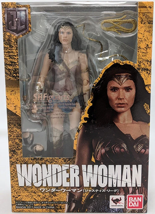 Description: From Tamashii Nations. From the Justice League movie comes a new addition to the S.H.Figuarts line, Wonder Woman! Wonder Woman figure will include multiple interchangeable hands, an additional swap out portrait, a sword, a shield and two lassos. She stands about 6″ tall and comes with a stand for display.