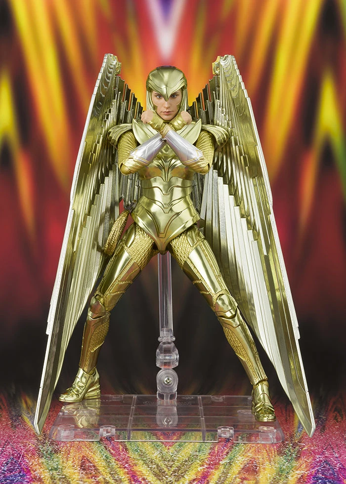 Description: From “Wonder Woman 1984,” the Wonder Woman Golden Armor version joins the S.H.Figuarts lineup! In addition to the gorgeous new golden coloration, the figure includes a stand for supporting the wings in dynamic poses. Included lasso and hair options let you re-create your favorite scenes. [Set Contents] Main Body, Three optional pairs of hands, Optional head, Optional hair, Set of wing parts, Wing support rod set, Lasso of Truth, Lasso of Truth belt hook. WW84